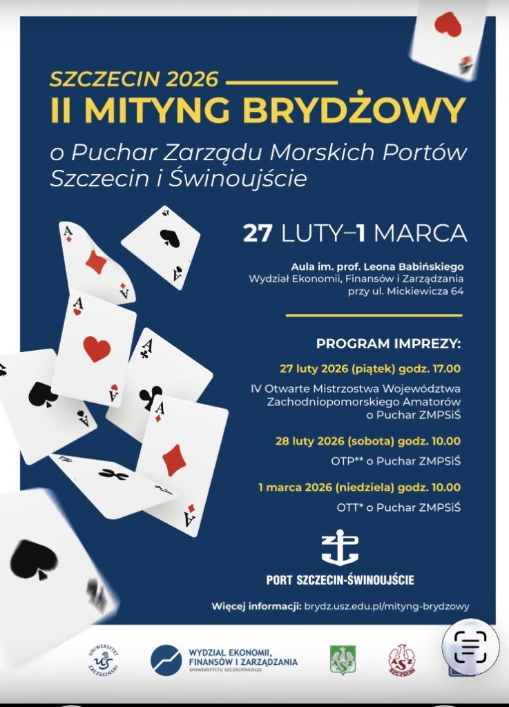W imieniu Rektora Uniwersytetu Szczecińskiego prof. zw. dra hab. Waldemara Tarczyńskiego oraz Prezesa Zarządu Morskich Portów Szczecin i Świnoujście dr Jarosława Siergieja zapraszamy do udziału w II Mityngu Brydżowym Szczecin 2026 o Puchar Zarządu Morskich Portów Szczecin i Świnoujście, który odbędzie się w dniach 27 lutego – 1 marca 2026 roku na Uniwersytecie Szczecińskim.